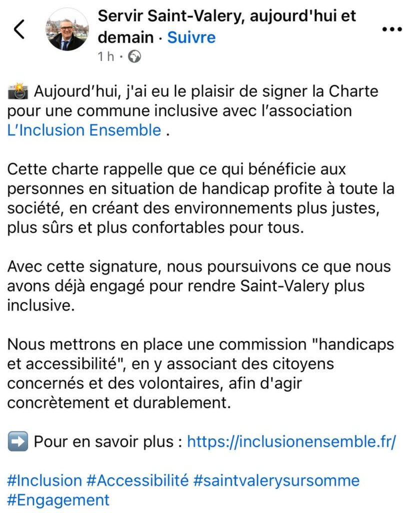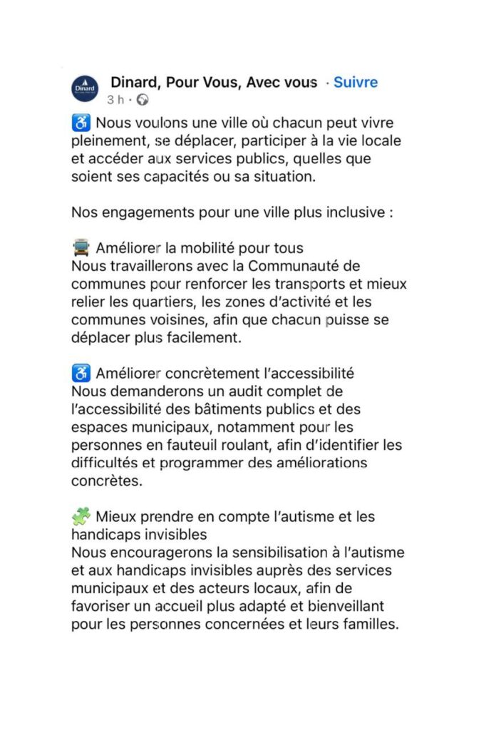 Je m’engage à tout mettre en œuvre pour favoriser les déplacements, l’accueil et la pleine participation des personnes en situation de handicap dans tous les lieux et instances, afin de favoriser l’accès aux services, aux soins, aux écoles, dans les centres de loisirs et les cantines, dans les associations, dans les activités culturelles, sportives et de loisirs de la commune.